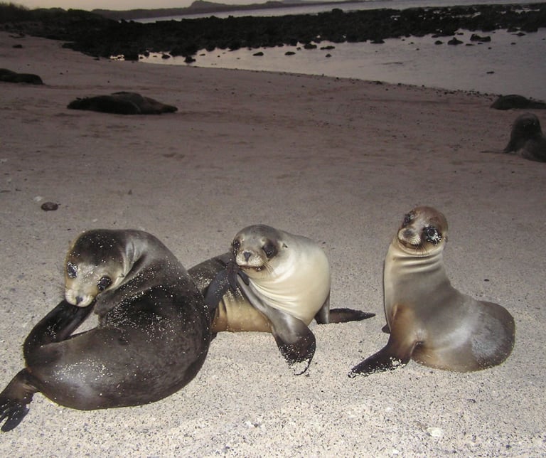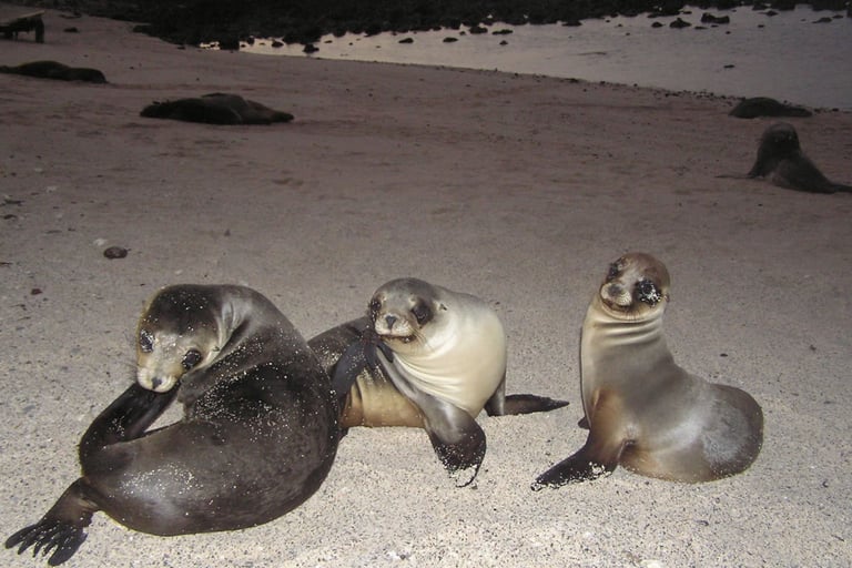 Los piqueros patas azules anidan a los dos lados del camino donde parejas para aparear hacen su danza de cortejo. Además, podrás encontrar magníficas y grandes fragatas anidan en los arbustos, inflando sus bolsas rojas para atraer a una hembra. Cabe mencionar que North Seymour es el hogar de uno de los más grandes colonias de leones marinos en Galápagos. Y en esta isla se puede hacer snorkel con miles de coloridos Pez galápagos, Leones marinos, tiburones de arrecife, tortugas de mar, picadura y manta rayas, anguilas, y tal vez incluso tiburones martillos.