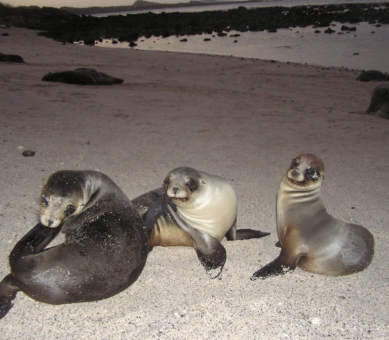 A few hundred meters away from the Eastern cost of Santa Cruz Island, South Plazas and North Plazas islands were formed from uplifted seabed, giving it a tilted tabletop quality. You will disembark on South Plazas where you will be greeted by a colony of sea lions. Further up the shore a carpet of scarlet sesuvium succulents serves as groundcover for a grove of luminescent green prickly-pear cactus. Yellow-gray land iguanas sit beneath, waiting patiently for pears to drop.